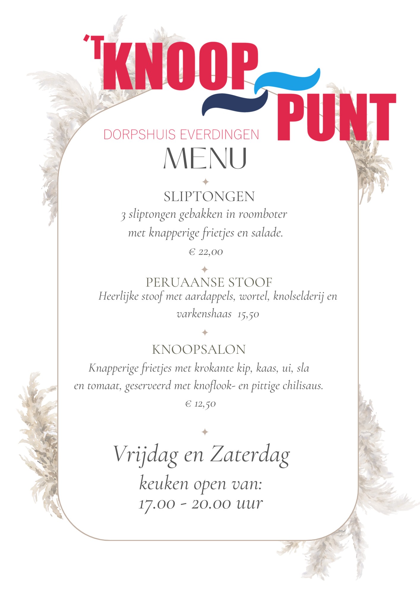 Elke week is er weer een nieuw menu met terugkerend onze vertrouwde Knoopsalon. Volg ons op facebook voor het menu van deze week.